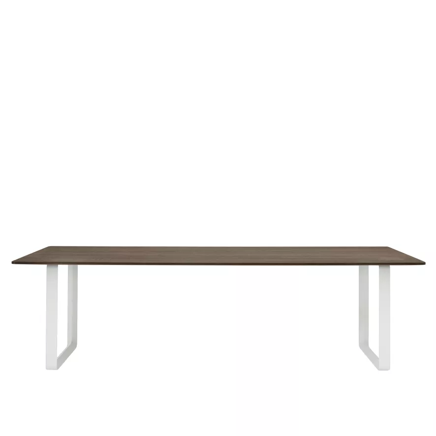 De 70/70 tafel 255×108 van Muuto heeft een breedte van 255 centimeter, een lengte van 108 centimeter en een hoogte van 73 centimeter. Deze tafel heeft een onderstel van aluminium dat afgewerkt is met een poedercoat. Het tafelblad is gemaakt van FSC-gecertificeerd, massief, gerookt eikenhout. Dit tafelblad mag niet langdurig worden blootgesteld aan direct zonlicht, hitte of een hoge luchtvochtigheid. Het houten blad dient met een zachte doek, in de richting van de houtnerven, schoongemaakt te worden. Om het eikenhouten tafelblad in optimale conditie te houden is het aan te raden het hout 2 tot 3 keer per jaar, zowel boven als onder, met een speciale olie voor eikenhout te behandelen. De 70/70 tafel 255×108 van Muuto is in verschillende uitvoeringen verkrijgbaar.