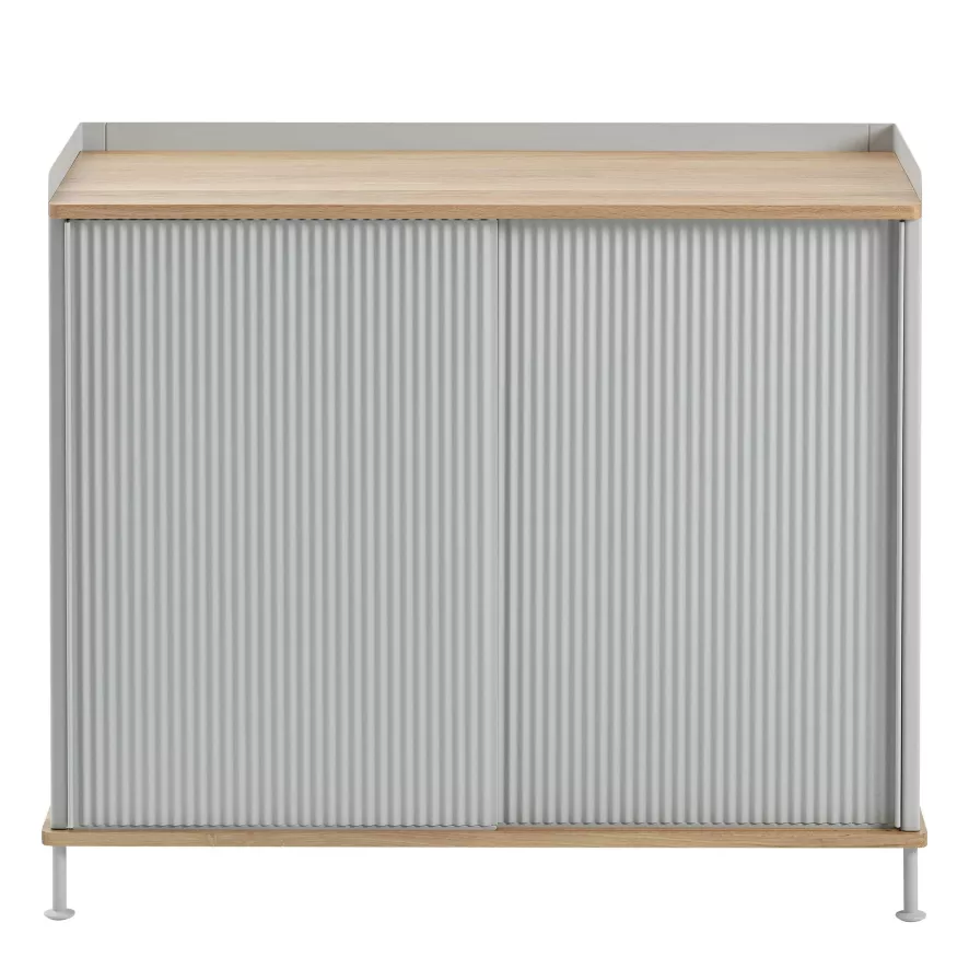 Het Enfold High dressoir van Muuto heeft een lengte van 99,5 centimeter, een diepte van 45 centimeter en een hoogte van 84 centimeter. Het dressoir is gemaakt van massief eiken en gelakt staal. Je kunt voor Enfold kiezen uit verschillende kleuren. Enfold is ook in een lagere variant verkrijgbaar, het Enfold Low dressoir.
