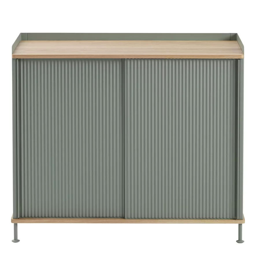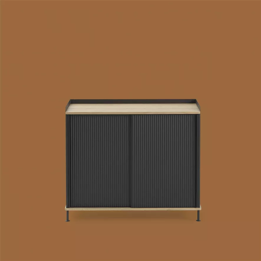 Het Enfold High dressoir van Muuto heeft een lengte van 99,5 centimeter, een diepte van 45 centimeter en een hoogte van 84 centimeter. Het dressoir is gemaakt van massief eiken en gelakt staal. Je kunt voor Enfold kiezen uit verschillende kleuren. Enfold is ook in een lagere variant verkrijgbaar, het Enfold Low dressoir.