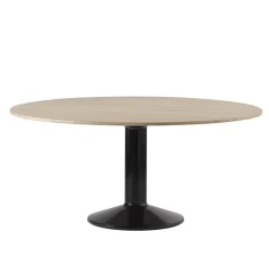 De Midst eettafel 160 van Muuto heeft een diameter van 160 centimeter en een hoogte van 73 centimeter. De tafel heeft een onderstel van staal en is met een poedercoat afgewerkt. Het tafelblad is verkrijgbaar in een eikenhouten en een linoleum uitvoering. Beide varianten zijn in diverse kleuren en afwerkingen verkrijgbaar. Deze eettafel is geschikt voor 8 personen en mag alleen binnenshuis gebruikt worden. De Midst eettafel 160 van Muuto is in verschillende kleuren en formaten verkrijgbaar.